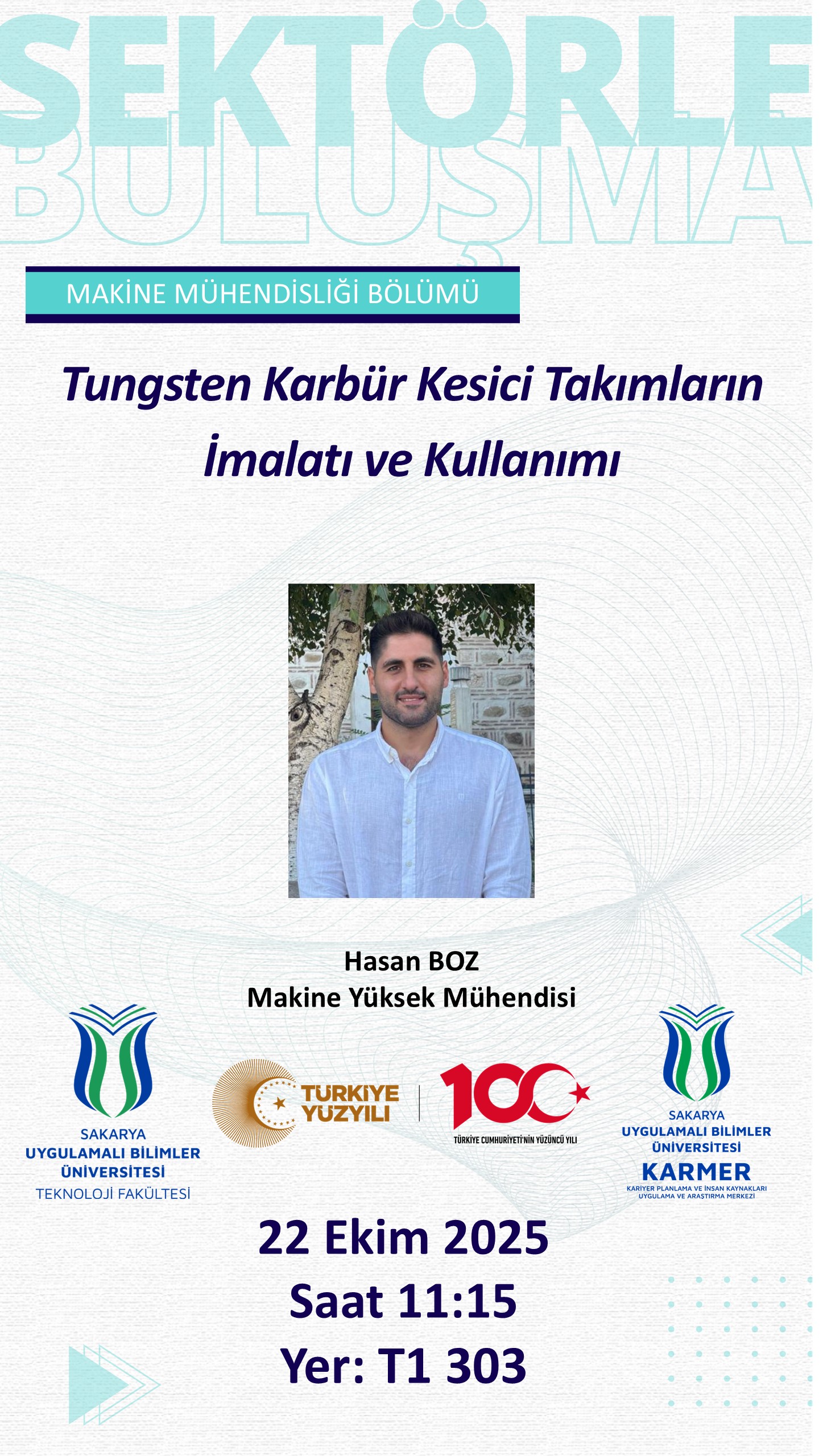 Sektörle Buluşma etkinliği kapsamında, Makine Yüksek Mühendisi Hasan BOZ tarafından “Tungsten Karbür Kesici Takımların İmalatı ve Kullanımı” konulu bir seminer verilecektir.