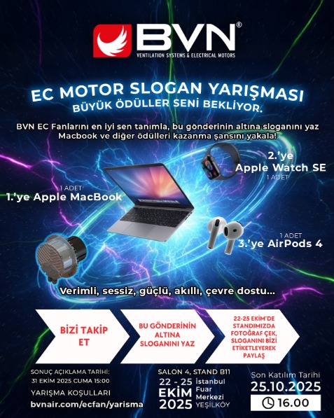 BVN firması tarafından düzenlenen “EC Motor Slogan Yarışması” ile yaratıcı fikirler ödüllendiriliyor. Katılımcılardan BVN EC fanlarını en iyi şekilde tanımlayan özgün bir slogan üretmeleri beklenmektedir.